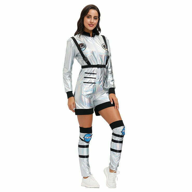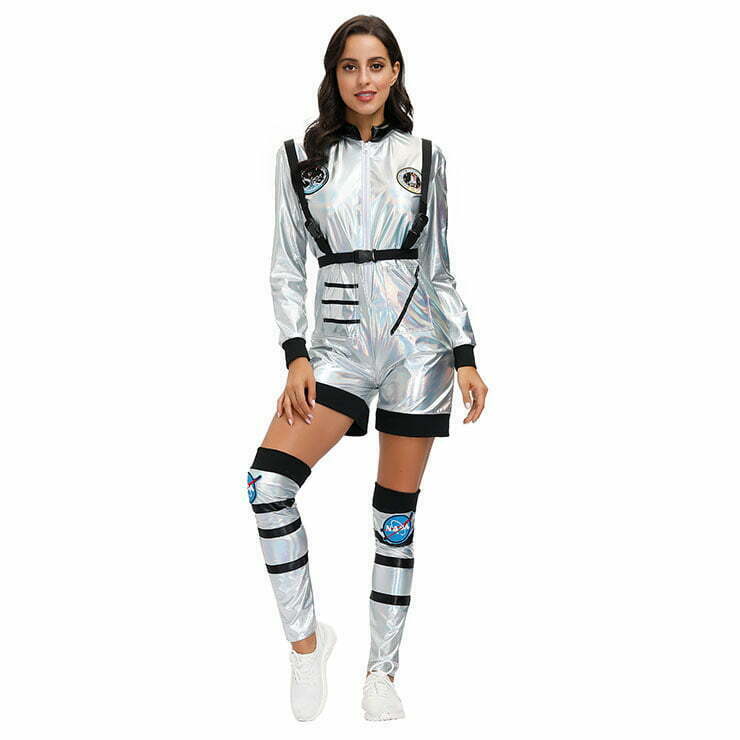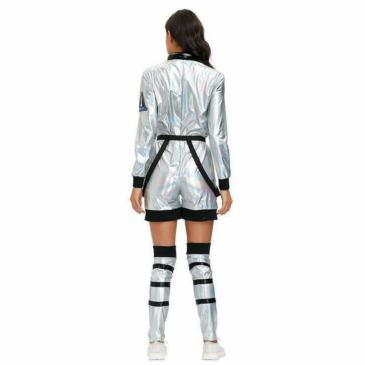 תחפושת אסטרונאוטית חליפת חלל לנשים כוללת סרבל כסף מתכתי עם צווארון עומד, שרוולים ארוכים ומכנסיים קצרים עם עיצוב לוגו רקום, סגירת רוכסן קדמי, רצועות נשלפות תואמות ושני כיסויי רגליים. (הנעליים לא כלולות)