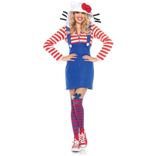 שמלת הלו קיטי בצבע כחול עם פסים אדום לבן וכובע עם אוזניים פפיון ושפם למראה מקסים וצעיר