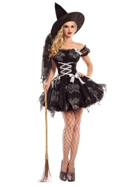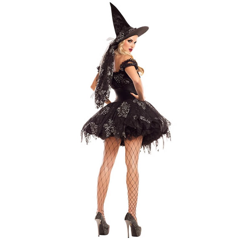 התחפושת כוללת: שמלה שחורה עם עיטורים בכסף, כובע מכשפה