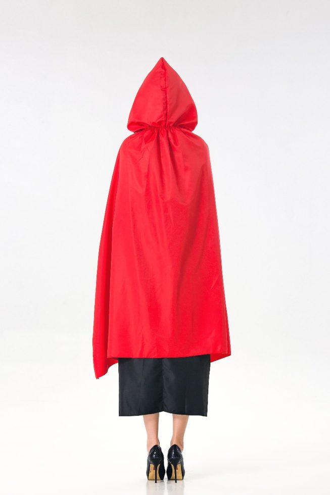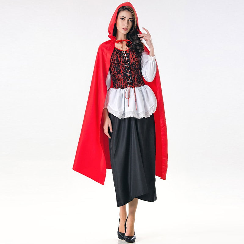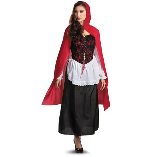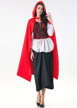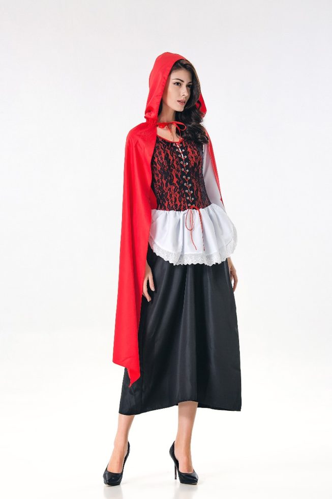 תחפושת כיפה אדומה כוללת: שמלה ארוכה עם צווארון עגול, שרוול לבן באורך 3/4, מחוך אדום עם כיסוי תחרה פרחוני, פירוט שרוכים קדמי, חצאית מיני לבנה במראה סינר, תחתית חצאית שחורה, שכמייה אדומה ארוכה ( הנעליים לא כוללות).