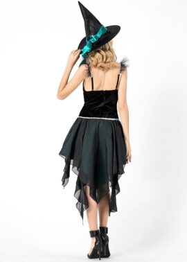 תחפושת מכשפה סקסית בעלת שמלה קצרה מרהיבה בצבעים טורקיז ושחור עם עיטורים
