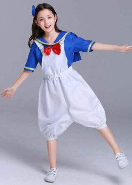 תחפושת פופאי לילדים יוניסקס כוללת חולצת מלחים כחולה עם צווארון מלחים ועיטורי זהב, כתפיות מלחים לבנות בסגנון רטרו עם אבזמי מתכת מתכווננים ברצועות ורצועה אלסטית מתכווננת במותן, מכנס בעיצוב נפוח, כובע מלחים כחול תואם ועניבת פרפר אדומה.