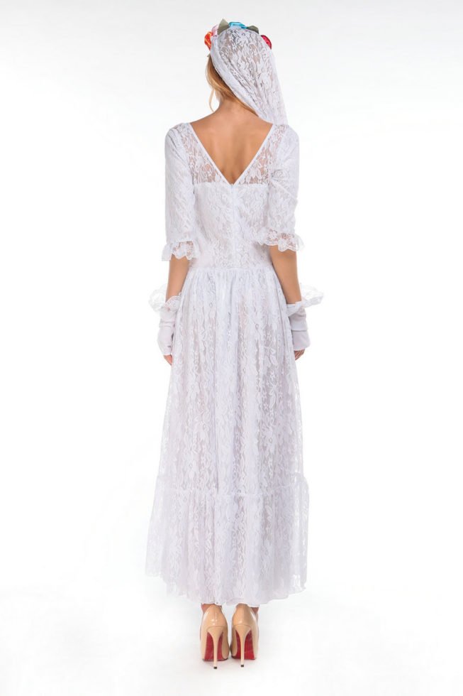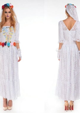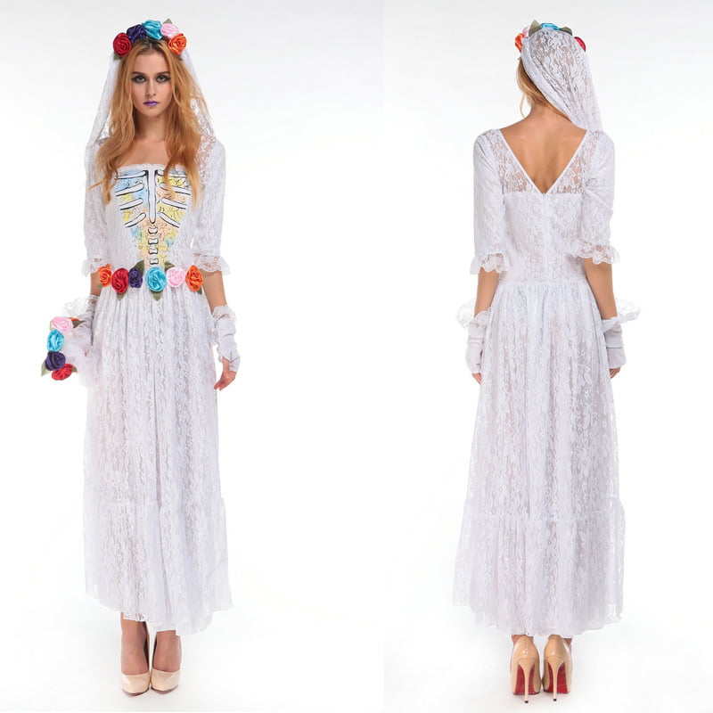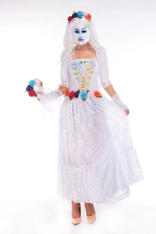 Celebrate the dead till death do you part in this La Novia Muerta costume featuring a white wedding dress with white lace detail, skeleton print bust, white veil with rose headband, white gloves. (Bouquet not included.)